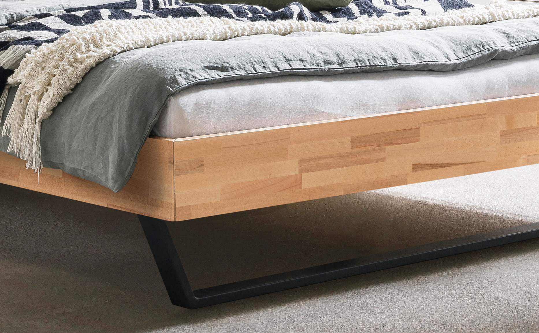 Das Modell Sariano besticht durch anthrazitfarbene Kufenfüße, die dem Gestell eine ausgewogene Leichtigkeit verleihen, während Holzblenden einen harmonischen Übergang zum gepolsterten Kopfteil schaffen.